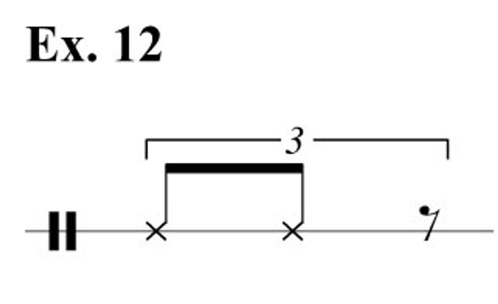 Here’s another twist: Make a simple rhythm, but one that the melody won’t fit into evenly. For example, our 21-note melody fits into groups of three, but not groups of two. Ex. 12 shows a basic rhythm (the “heartbeat”) that uses two notes.