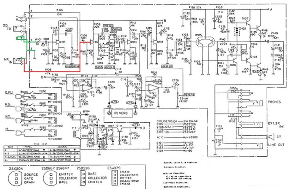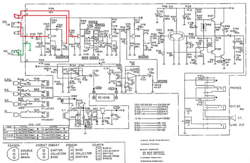 But as you’ll see in Fig. 2, things change once a guitar is plugged into the overdrive input. The red trace coming from this jack feeds the first gain stage (Q101). The output of this stage is connected to the overdrive control. The next red trace shows the output of this control going through one set of switching contacts contained in the overdrive jack, which are closed when a 1/4" plug is inserted into this jack. The signal then goes to the second gain stage (Q102) and, as before, on to the tone stack and then the normal volume control.