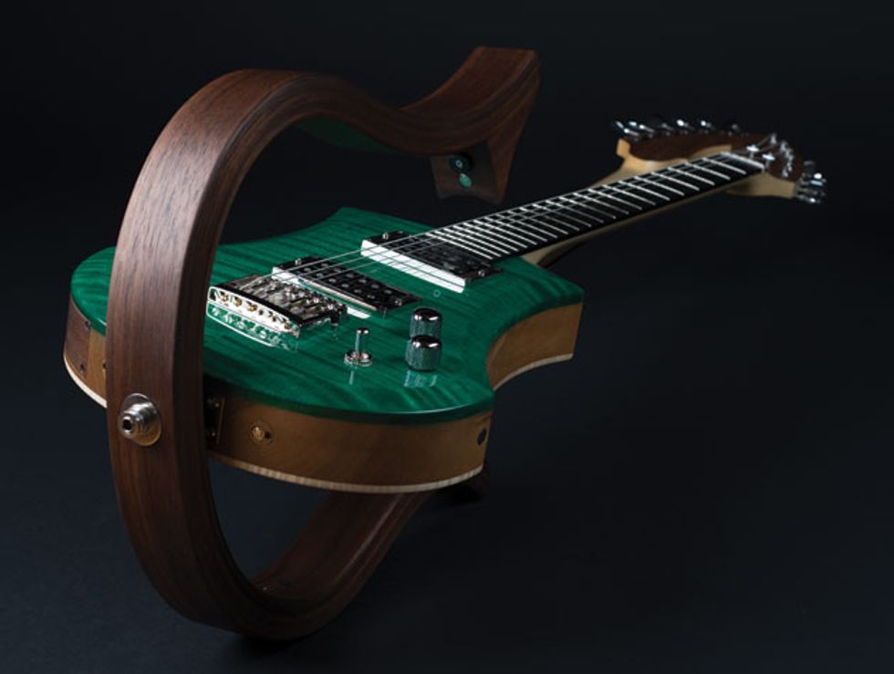 The Galileo sports a green electric guitar on one side and a red nylon acoustic on the other. While the two guitars are rather traditionally equipped with two humbuckers and a Schertler Lydia for the acoustic, more effort went into conceiving the flip mechanism. The solid hinge at the bottom is built around the output jack and is the only mechanical connection while rotating. Extra strong magnets help position the guitar, and a lock keeps the desired guitar in place. The two necks are angled apart by approximately 10 degrees. Surprisingly, there isn’t much difference in playability between the electric and acoustic guitars, but those who play with the thumb over the neck might get stuck when working further up the fretboard. Meier is another builder focusing on local woods. On the Galileo he used maple, spruce, and walnut, finished with a glossy polyurethane coating.