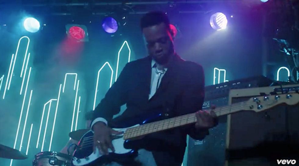 Bruno Mars’ bass player, Jamareo Artis, getting busy during the "Uptown Funk" music video.