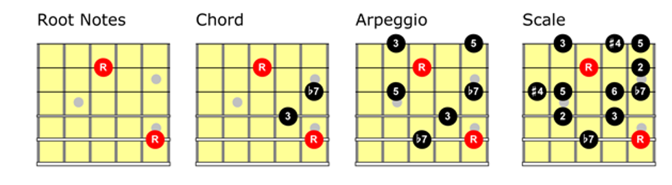 From this perspective, learning scales or improvising doesn’t have to be stressful. You’re at the 9th fret and you need to play A Lydian dominant? No problem. I can see the root note, the A7 chord, the A7 arpeggio, and I can see the scale. If you’re struggling to see any step, then it’s as simple as working on the previous stage until it’s effortless. In the diagram below you can see how we would handle A Lydian dominant from root to scale.
