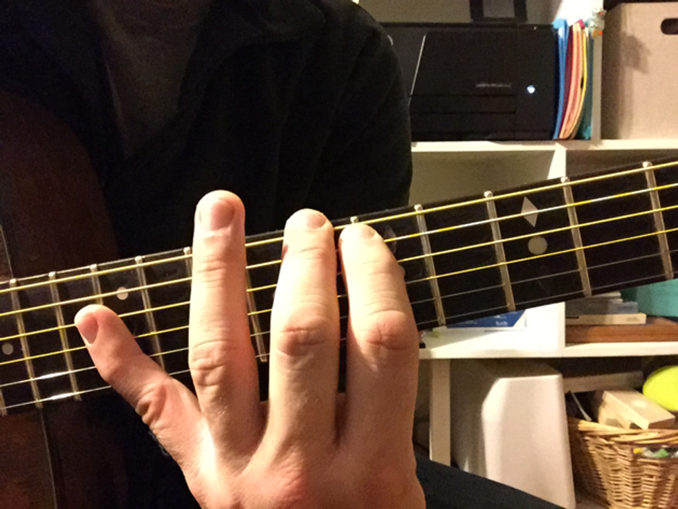 You can produce a natural harmonic by lightly touching a string with a fretting finger that’s strategically placed over a specific fret. The note is slightly muted and rings out as a harmonic. There are natural harmonics exactly above or near the 3rd, 4th, 5th, and 9th frets, but today we’ll focus primarily on the 7th and 12th because of their melodic characteristics and accessibility. Place your first finger over the 7th fret and your fourth over the 12th fret. In Photo 1 you can see how I position my hand to make the reach. (My guitar teacher always told me not to flatten out my fingers, but in this case it helps.) Remember, you’re not pressing the string against the fret, but rather laying your fingertip on the string directly over the fret, and then plucking the string with the other hand. Also, keep your thumb in the center of the neck ... just imagine you’re holding a grilled cheese sandwich.