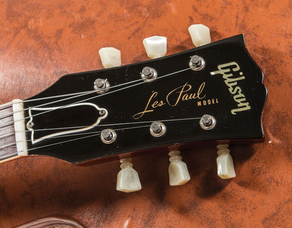 A truly iconic sight: The classic Gibson angled headstock displaying the company’s logo and “Les Paul model.”