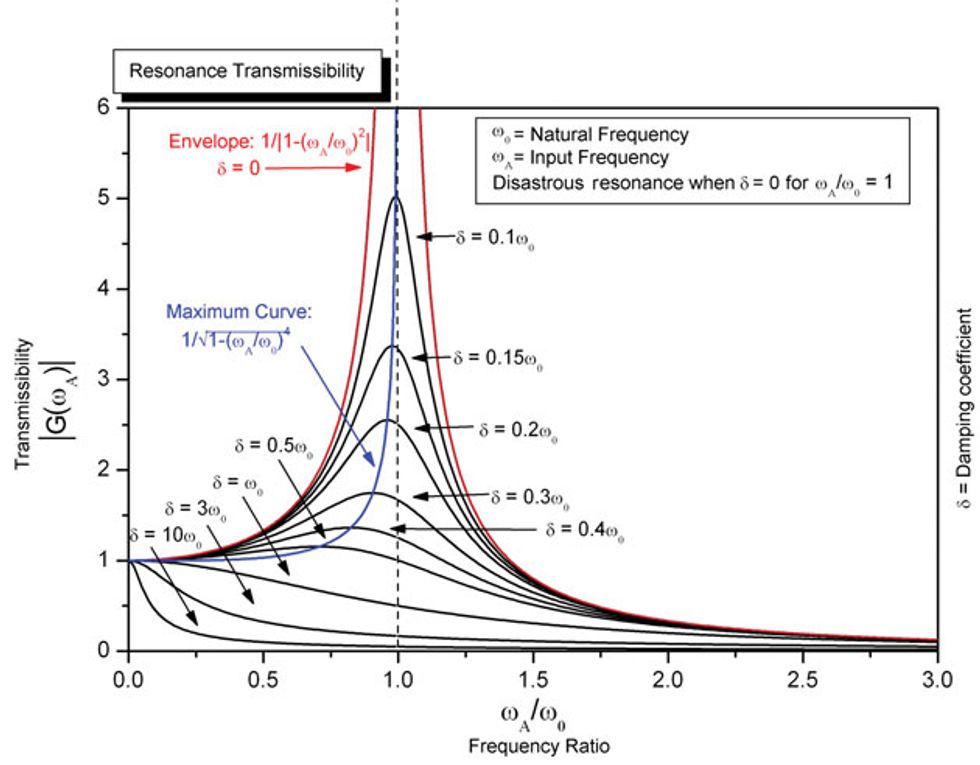 Here’s what Fig. 1 tells us about the quotient of the input frequency (low E) and natural or secondary frequency (fretted note): There is a maximum of transmitted energy between the two when their frequencies are identical or at least very close to each other. Resonance isn’t a broad frequency phenomenon—it’s limited to small frequency bands.