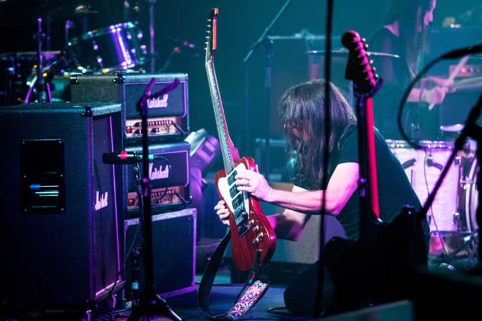 Cep lets his 1967 Gibson Firebird feed back into his stereo, dual-Marshall TSL60 amp rig. Photo by James DellaRocco