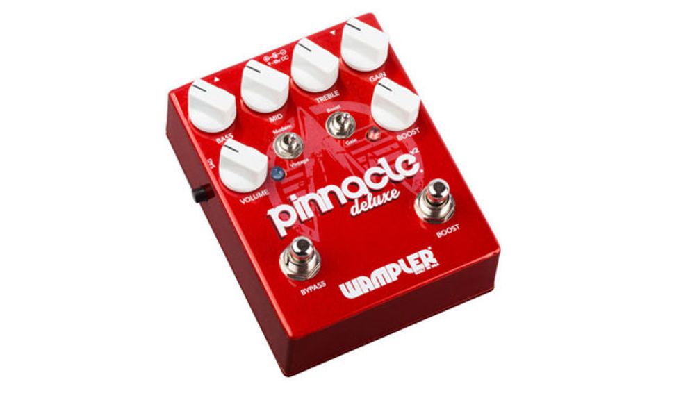 Brian Wampler designed the original Pinnacle Standard and Deluxe with the “Brown Sound” in mind. With the new Pinnacle Deluxe v2, Brian wanted to break outside of the “Brown Box” and provide a versatile distortion for any players needs (though retaining what made the Pinnacle special to begin with). Brian’s way of enhancing the control of his best selling distortion pedal came by providing a 3-band EQ (bass, mids, treble) to fine-tune the EQ to match the guitar and amp the player is using. The modern/vintage switch alters the EQ frequencies, with modern having a edgier, more aggressive crunch that focuses on the highs and lows. The vintage setting is warmer with fatter mid frequency response that really fills out the tone for the classic rock lovers. The gain/boost switch takes the saturation up to the next level, with the boost providing a substantial increase in gain, similar to an amp screaming on 10. Additionally, there is a new SAG switch on the side, which helps control the amount of compression and saggy crunch to tighten up the gain with high-output pickups. The Pinnacle Deluxe also comes with an independent boost switch which is controlled via the boost knob. Based on a popular green pedal, it gives an extra option of boosting the pre-gain with a mid-centered overdrive that is designed to fatten up the gain and cut through the mix.