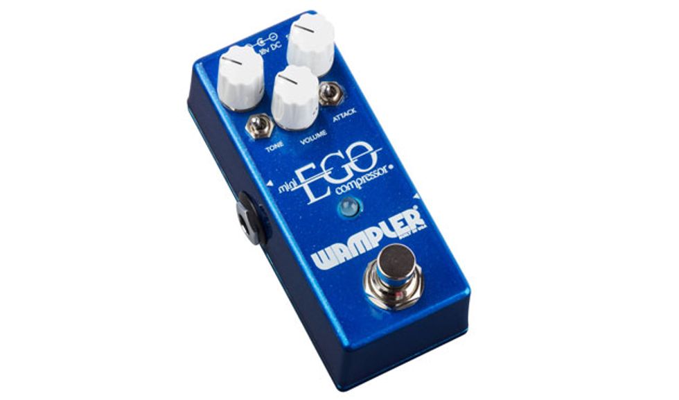 Wampler Pedals, creators of the original Ego Compressor TM , have received countless requests from players for a mini version of the pedal for saving space on cramped boards or ease of use on fly rigs. Brian’s solution comes in the form of the Mini Ego Compressor. The Mini Ego still showcases the same functionality and tone as its larger counterpart, having control over the output level and sustain, along with the blend knob for blending in the compressed signal with the clean signal. The attack and tone knobs have been converted to 2-way switches, with each selection on the switch correlating with popular settings based on the full size Ego Compressor. Engaging the tone switch adds presence to the compressed signal, giving a bit more clarity that can be lost with compression. The attack switch features a Soft attack and a hard attack mode. Soft attack makes the compressor not clamp on the signal as quickly, but provides added sustain as the note decays. The hard attack makes the compressor engage quicker, clamping down on the note closer to the initial attacked of the note for a more classic “pop and squish” that is known for funk and country playing.