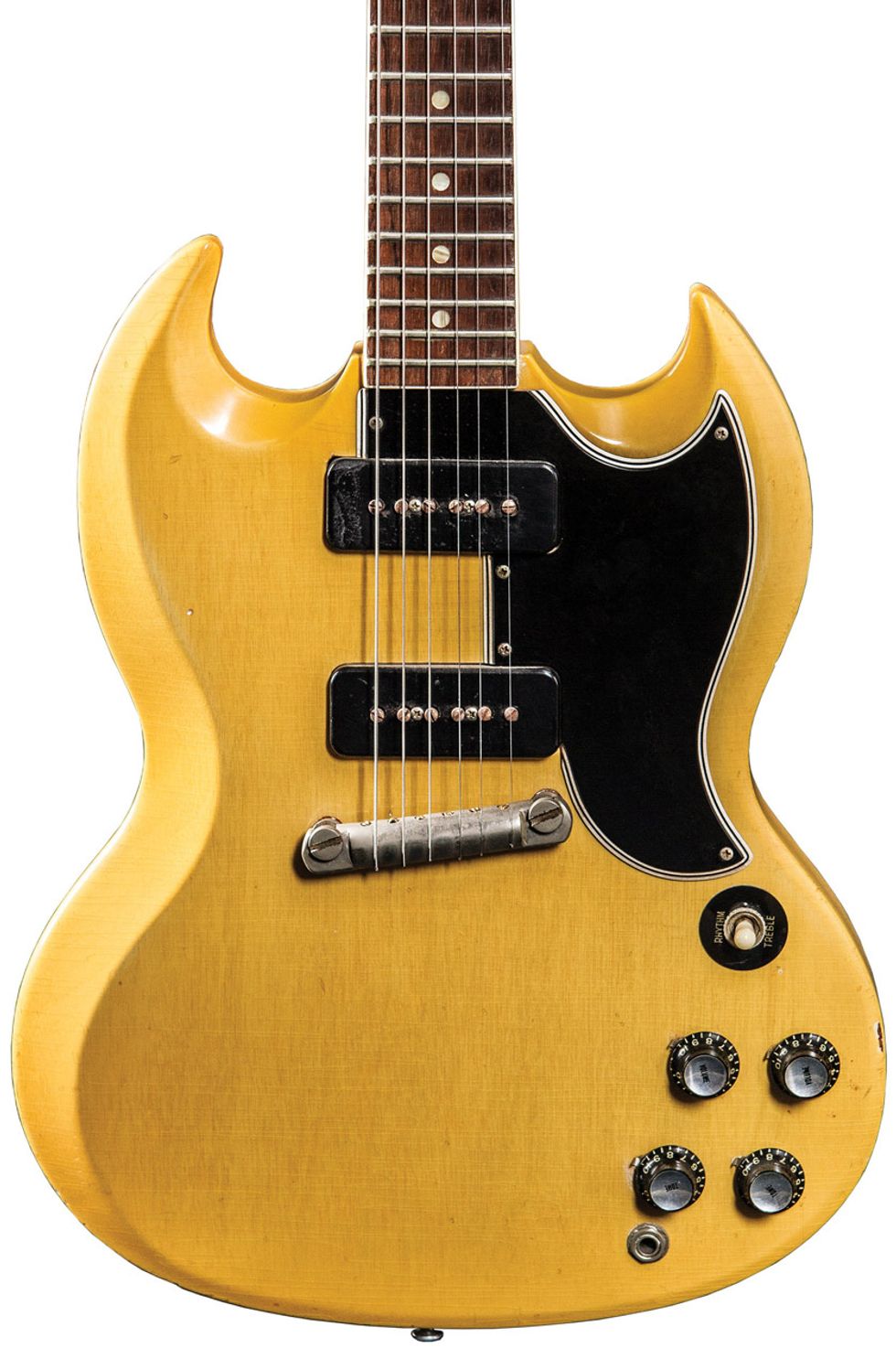 The 1961 SG Special pictured here has the early features particular to the first half of that year. These include a level neck joint transition on the back where the body and neck meet—which proved unstable and was replaced with a ledge that became more prominent after 1962—and a slanted combination bridge tailpiece, which was replaced at the end of '61 with a compensated tailpiece with the studs parallel to the pickups. This example also has a TV Yellow finish, which was standard on the model before the change to the thin body shape. The color was replaced later in the year by an opaque creamy white. The 1961 list price was $210. The current value for one in excellent all-original condition is $7,500.