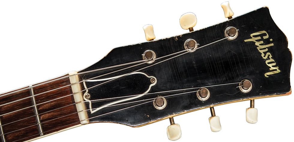This example's classic '60s-profile Gibson headstock has the patina of its years. The slightly bent tuning key indicates this guitar was more likely played than kept in a closet.