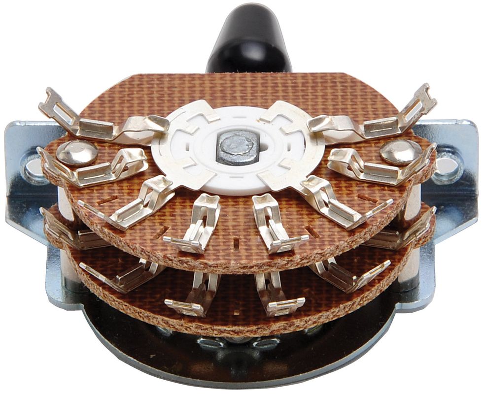The Göldo Double Wafer 3-way switch (Fig. 1 and Fig. 2) offers the same open construction as the Fender 5-way Super Switch. It's a 4P3T (four-pole, triple throw) blade switch with a total of 16 lugs, which are divided into four groups with a single common output and three input lugs. This is like having two standard 3-way switches in one package, and you can use this switch not only for Telecasters, but for any guitar that accepts blade switches. Capable of all kinds of fancy wirings, this switch pretty much eliminates the need for installing additional switching devices in a guitar because all you need is already there. This type of selector is also often called a 4-pole switch, a double-wafer switch, or a double-throw switch.