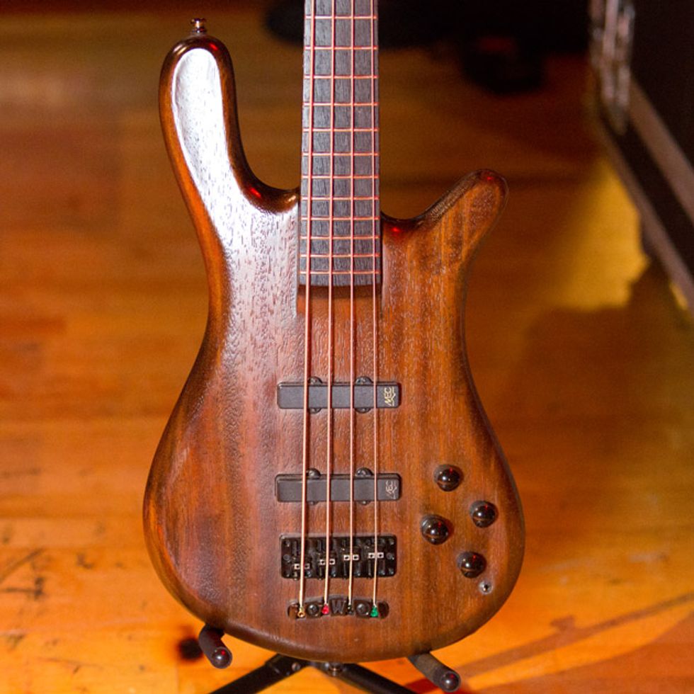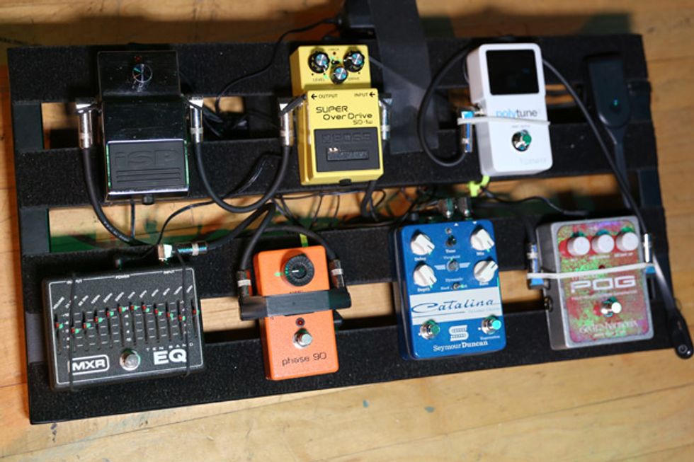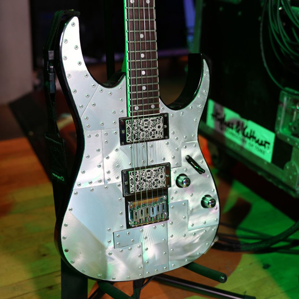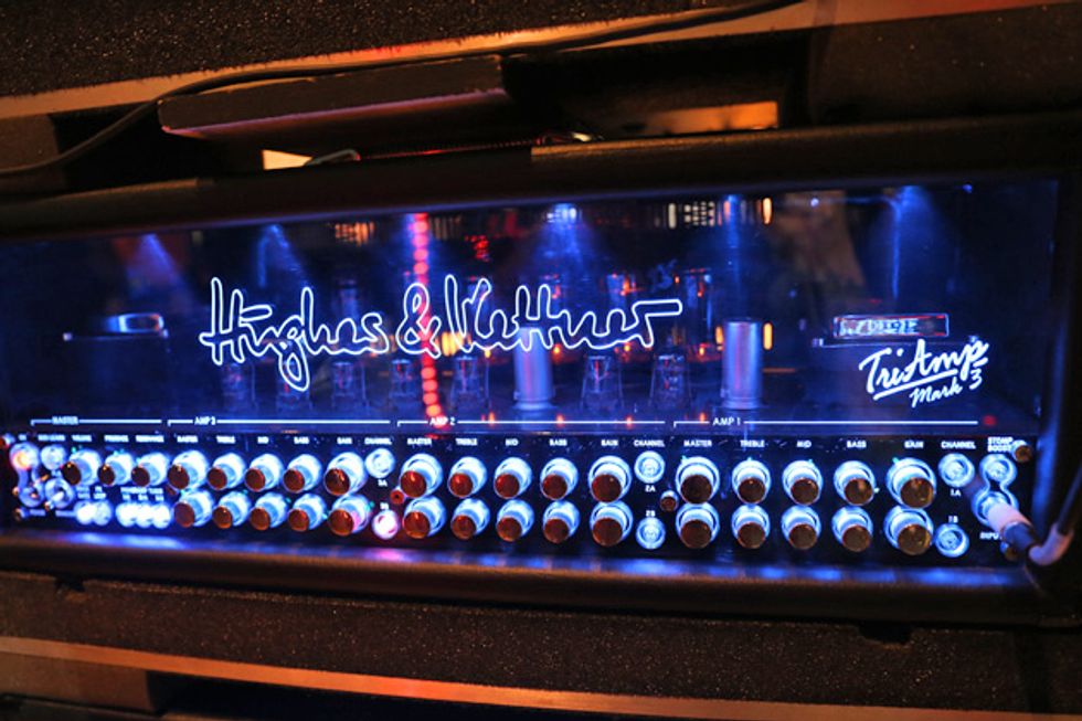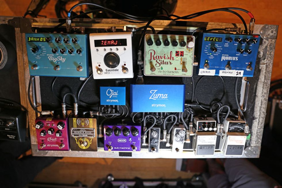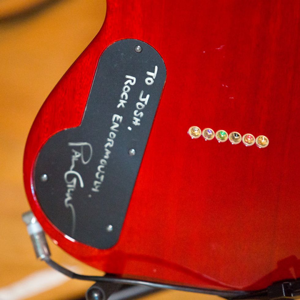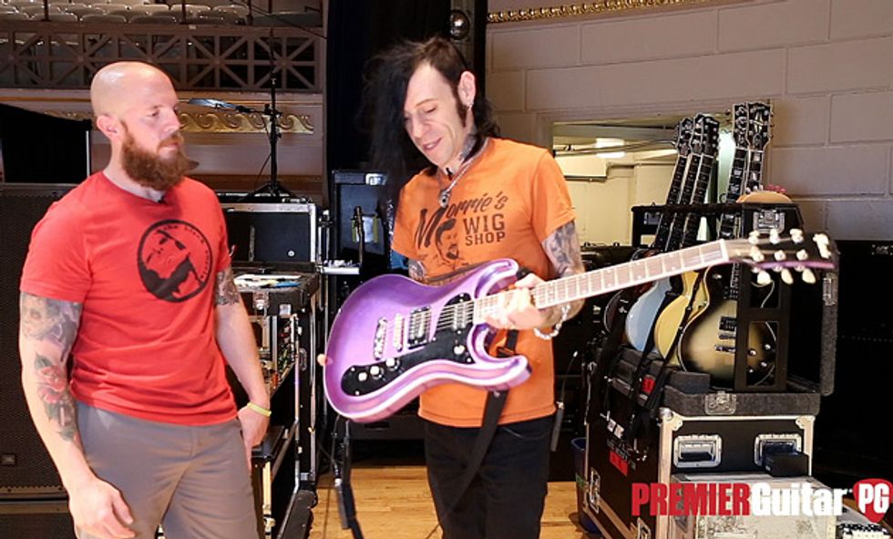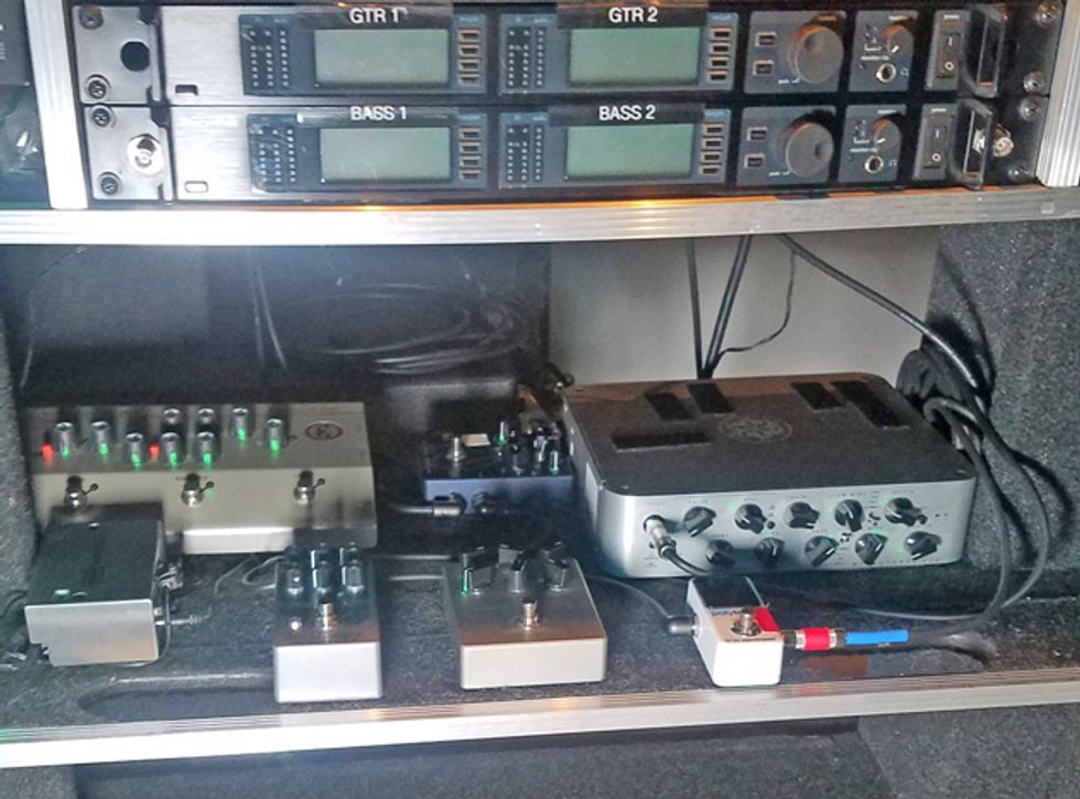 Guitarists Josh Rand, Christian Martucci (above right), and bassist Johny Chow spent over an hour with PG’s Chris Kies before the band’s gig at Nashville’s War Memorial Auditorium. Josh and Christian show off a whole new lineup of gear, including cherry axes making their live debut and revamps on their boards, while Johny proves you don’t need amps to rock out the low-end rumble.