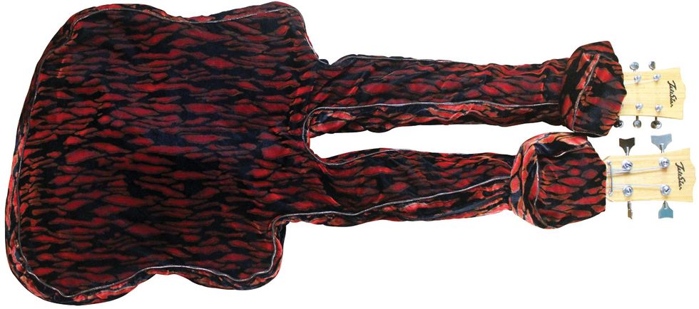 This 6/4 doubleneck is built pretty well for 1960s Japanese instruments. The pickups have a cool, airy quality and are just microphonic enough that they can really take off with a little fuzz, but run clean, they sound mellow and totally vintage. Though the body appears to be solid, this one is mostly hollow. I was lucky enough to buy mine with the original case and a beautifully insane “sock” that the original owner’s mom made for all his guitars (Photo 2). It’s like a psychedelic gig bag! Kudos to Jared Mattson for playing such a cool, old guitar.