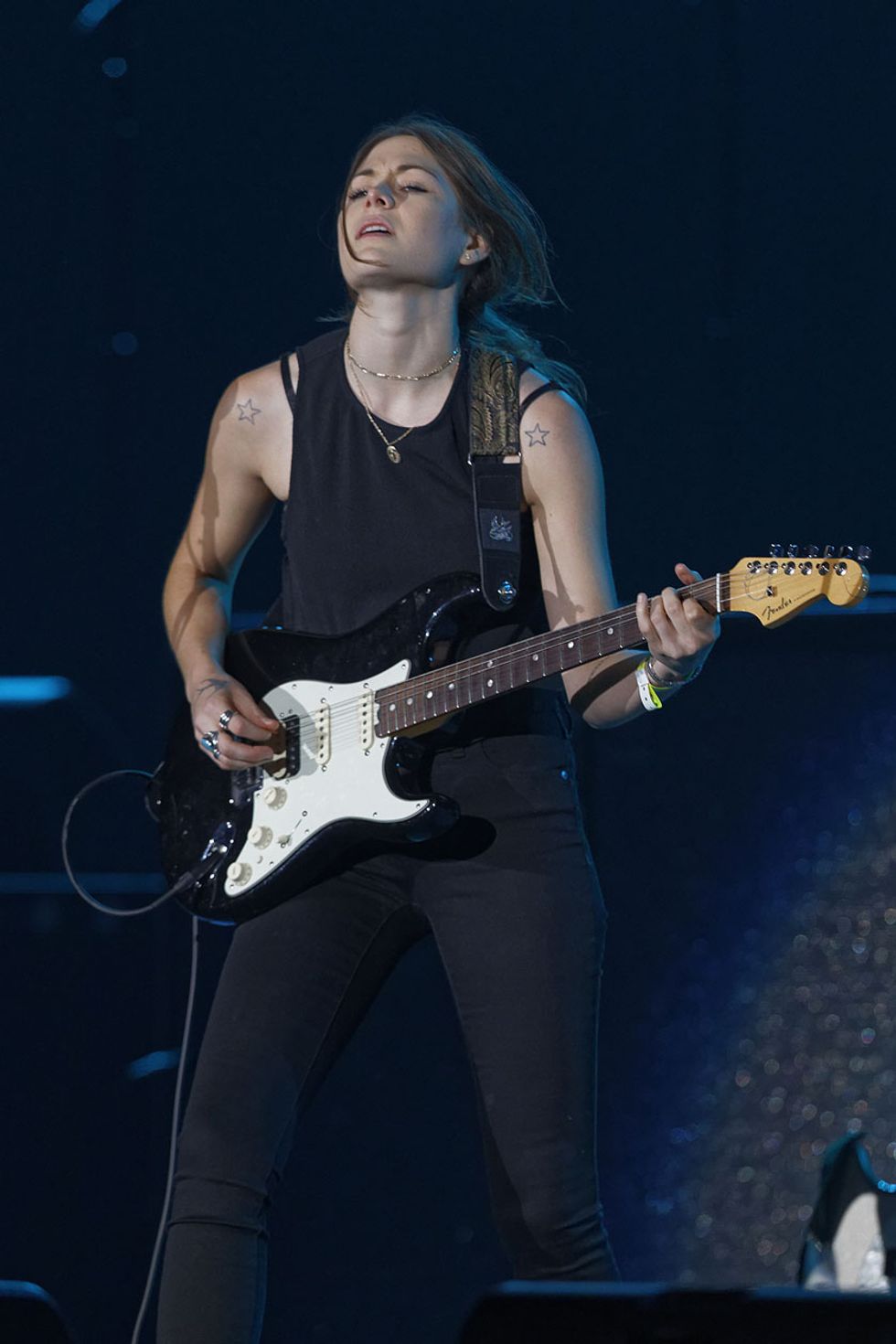 After discovering bluegrass with her sisters, Jessica and Megan, Rebecca Lovell started playing banjo and then migrated to mandolin in her mid-teens. “A few years into the formation of Larkin Poe, as we delved deeper and deeper into the blues, it slowly dawned on me that the sonic palette I was searching for was the guitar,” she says. Here she strums her Fender Stratocaster HSS Shawbucker onstage in Toledo. Photo by Ken Settle