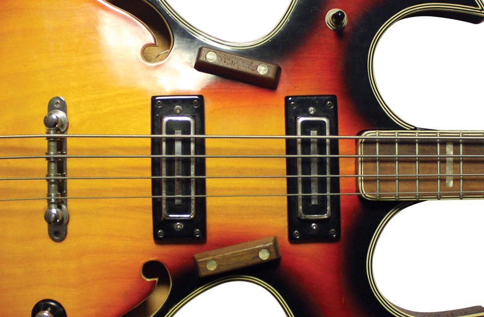 The PB-26 is a lightweight bass with a rather slender neck, so it’s easy to play. While standing, however, the bass feels really long, and the neck wants to dive a bit since the body is so light. The hollowbody guitars made at the old Teisco factory during the same period were built well, but always seemed to have a subdued tone. The PB-26 bass, however, sounds great with punchy blade-style pickups (Photo 2) that measure rather hot. The bridge is a simple Space Control-style unit that creates a good break-over angle, which gives this monster some good thump.