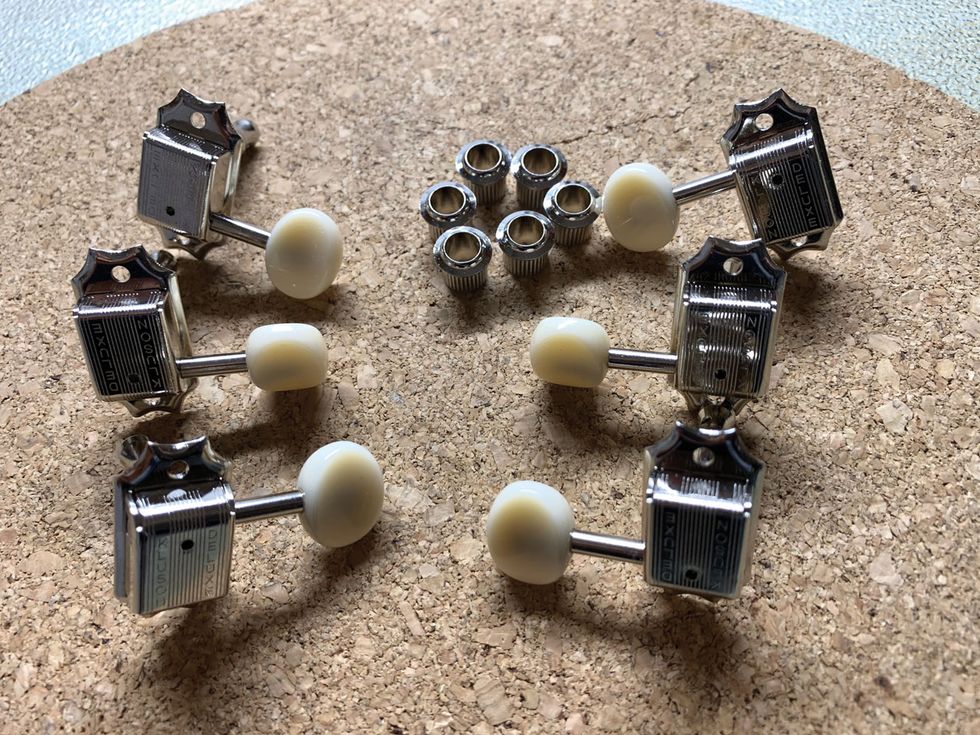 You can clearly see that the non-plated metal shafts of the tuners show more oxidation than the covers, which are nickel-plated. The shafts of our new tuners are nickel-plated as well, but we can mimic the vintage oxidation on them. More about this in a minute. So here is what we have: Our six individual tuners and their corresponding bushings, shown in Image 2. Look how shiny they are!
