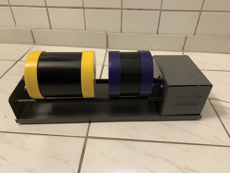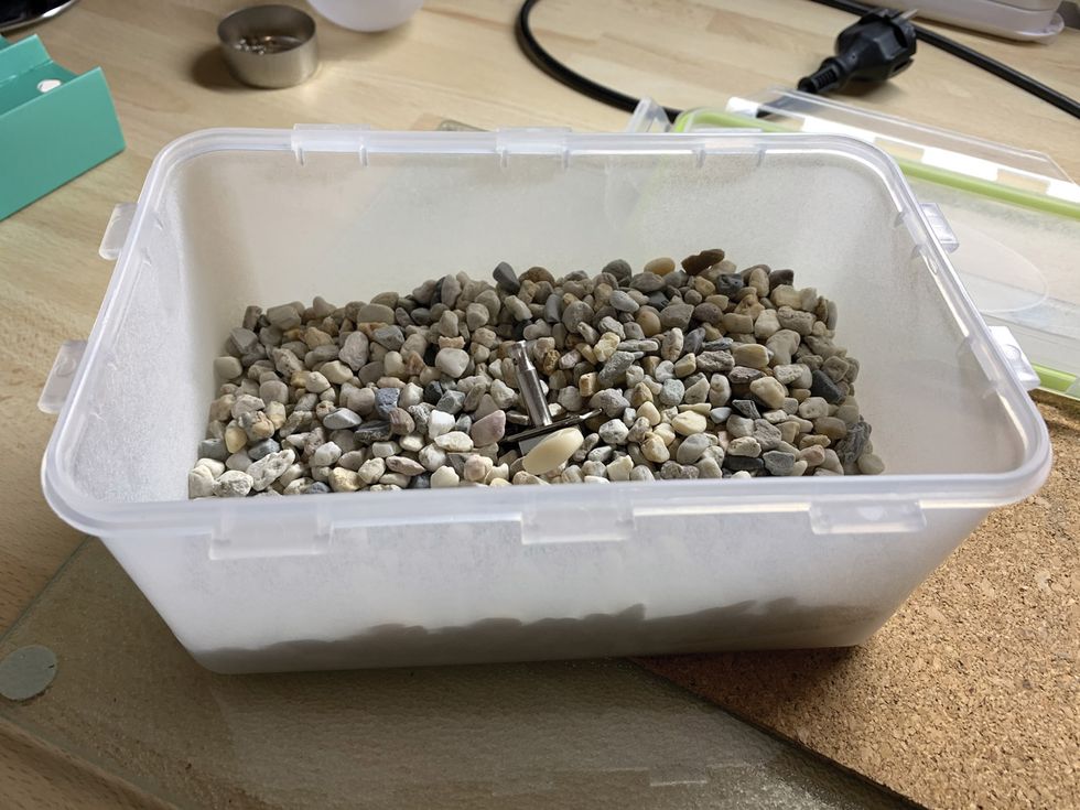 Check the result after a few minutes and, if you want more scratches, go on shaking. If you don't want to shake by hand or want to do this regularly, I recommend a small stone tumbler like we have in the shop, which does this work automatically (Image 7). Usually they're used for polishing, which is exactly the opposite of what we want to do here, but loading it with our mixture will work perfectly for relic'ing metal hardware.