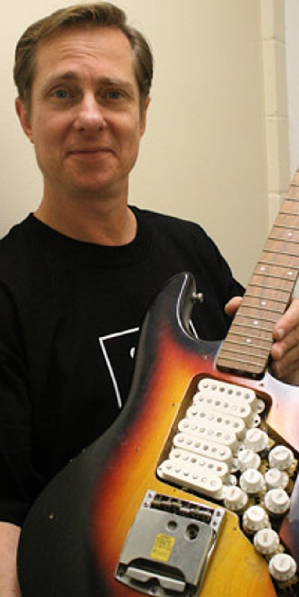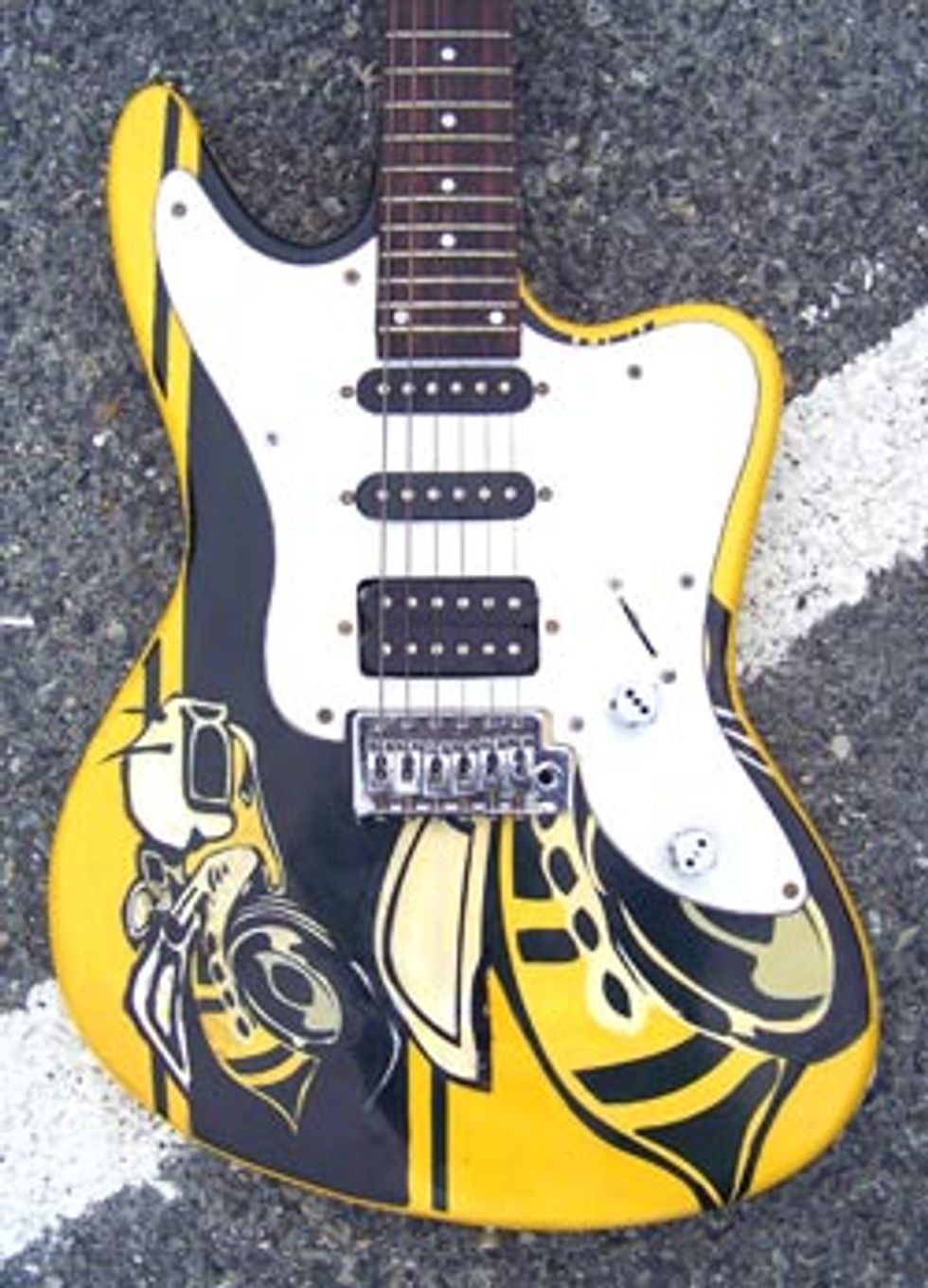 My dad worked in a music store when I was eight years old. I just started hanging out there, and I liked the guitar atmosphere of it, but I was also into Hot Wheels and building model cars. I started working at the store, and after awhile I started putting wheels from model car kits and using them as knobs, decals and flames on the body. Through my whole life, both worlds of guitars and hot rods have always coincided.