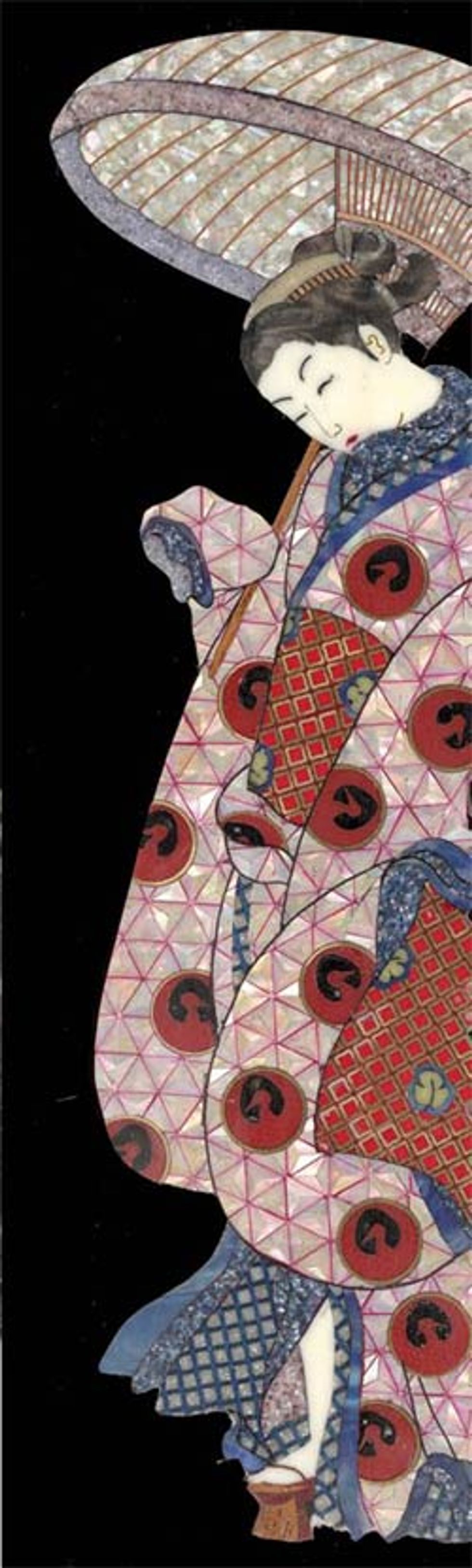 Threet has so far resisted expanding her palette: “Basically, I just use pearl and wood. I’ve tried other stuff—some metals and Recon stone (imitation semi-precious stone)—but those don’t give me my chatoyance fix! I do use a lot of different mother-of-pearls, my favorite being black, and I use a lot of different woods, many of whose names I don’t even know because I pick them up in cut-off bins at the local wood store. The biggest problem with wood is that you have to leave it out on the bench for a while to see how much it changes with exposure to air and light. Some gorgeous woods get ruled out quickly because you can’t rely on them to retain their color. But wood does have advantages. It’s usually pretty cheap—and sometimes its use actually simplifies the inlay process.”