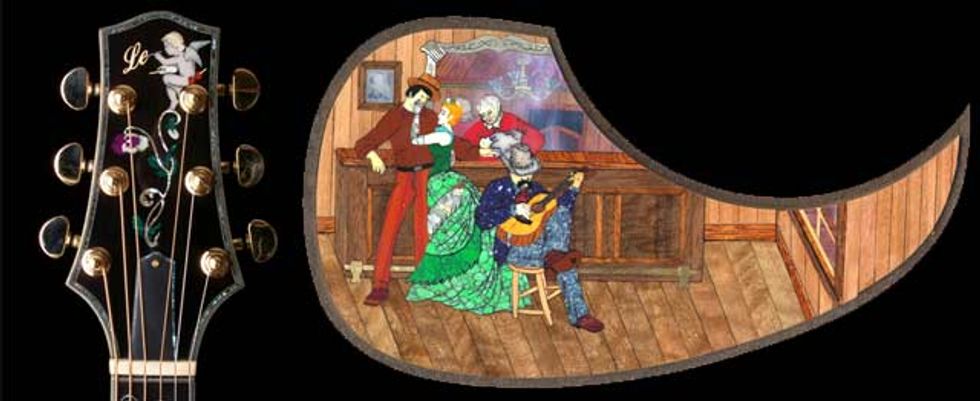 He relishes the freedom that comes from being one of a handful of dedicated inlay artists: “My boss is my customer; every day I have a different boss. They allow me latitude to use my imagination to come up with something that will be pleasing for them to look at many years down the road. That being said, I’m also leaving somewhat of a legacy. I’m 10 to 12 years out from the end of my inlay career, so I try to work to the utmost of my ability, since I know these guitars are going to be around 200 to 300 years from now.”