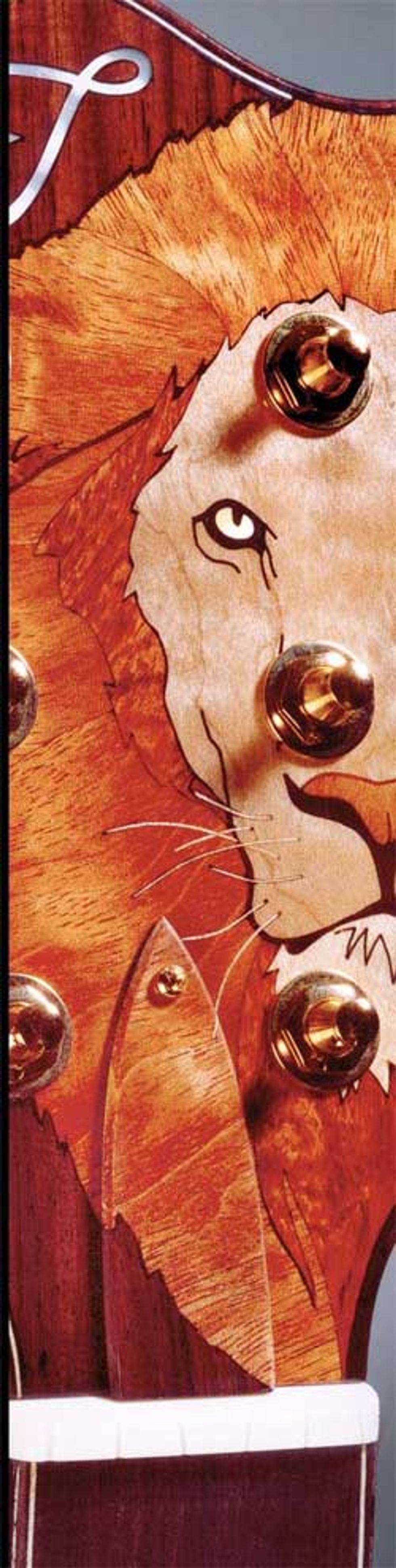 I asked Petillo to explain what marquetry is and how it works. “Marquetry,” he told me, “is an art form using inlaid wood veneers to form a picture, pattern, or design. It is done in two different ways: with X-acto knife blades of varying shapes, and with a jigsaw. It differs from conventional inlays in that marquetry is done in an overlay form—you make the whole piece or scene as a single overlay and then glue it into the instrument, such as an entire headstock veneer featuring many intricate cut shapes and designs. For example, I’ll make a background out of one piece of quilted maple and cut out and add flowers or something else to it, and glue the final piece onto the instrument all at once.”