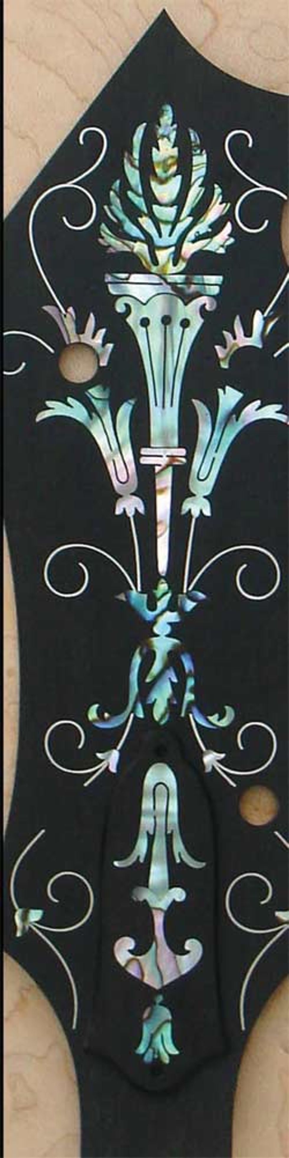 | Above: Ellis torch and wire mother-of pearl peghead overlay for Ellis mandolin |