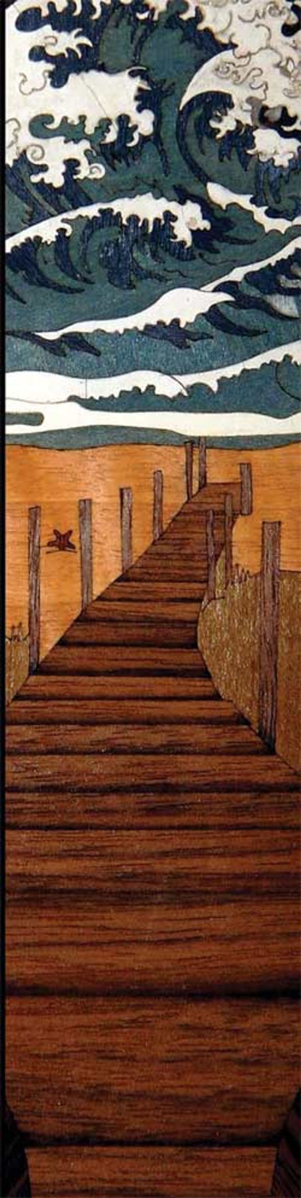 His work is often almost holographic, a technique he says he discovered almost by accident: “Abalam is basically shell—like abalone and mother-of-pearl—that has been sliced very thin, approximately .007 inches thick (about the thickness of a human hair), and then laminated like plywood into thicker sheets. You can buy Abalam as thick as you want, but the more layers, the more expensive it gets. A single sheet might be ten dollars, where a piece 1/16" thick might be well over one hundred. I had a polar bear inlay project where I needed to create the look of ice, and there is a shell called Donkey Shell that has a look that reminded me of the way ice would form on the windows in the Vermont winters where I grew up. So, me being a Yankee and therefore thrifty, I figured I would just buy a single sheet and glue it to a black substrate to make it thick enough to work with. When I did, the black showed through in places; amazingly the effect was exactly like ice! That got me thinking about the possibilities of using the translucence and the chatoyancy [the effects of light and angle on reflective material] of the thin shell to create mirrored effects.”