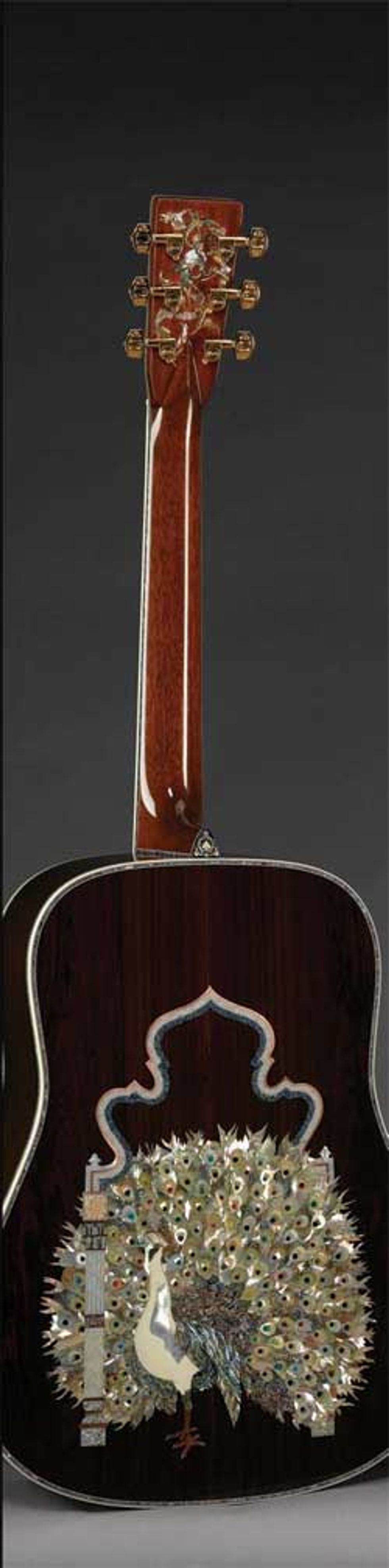 | Above: Back of Peacocks guitar: mother-of-pearl, red abalone, green abalone, Corian, copper, Abalam, ivory and silver. |