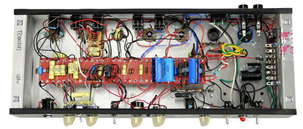Peaking inside the beautifully designed and cleanly laid out chassis, you can see a mix of NOS carbon comp and metal film resistors as well as a selection of Sozo caps. According to 65Amps, they use the carbon comps in the tonal paths and the metal film resistors where stability is critical. The Sozo caps are also a mix of modern and vintage styles. With all of these additions I was ready to get right to it and check out what the Tupelo had to offer, so it was time to plug in.