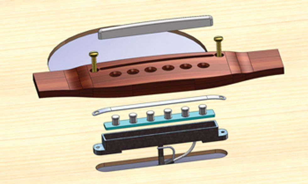 Taking a closer look at the design of the pickup in Fig. 1 will help us understand why this guitar was able to perform so well onstage in a high-volume setting. Like conventional undersaddle designs, the Takamine pickup employs six individual piezo-ceramic elements. This, however, is where the similarity ends.
