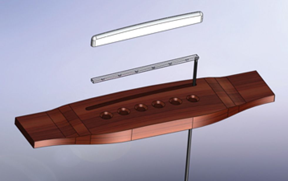 In more conventional undersaddle pickups used by most manufacturers (Fig. 2), the ceramic elements are quite small. Located directly under the saddle in a normal bridge slot that has been deepened to accommodate the height of the pickup, the ceramic elements are sandwiched between the bottom of the saddle slot and the bottom of the saddle. The saddle is not glued in or press fitted, but rather, allowed to slide in the slot. As the strings vibrate, the saddle acts like a piston and transfers the resulting change in force directly to the sensor.