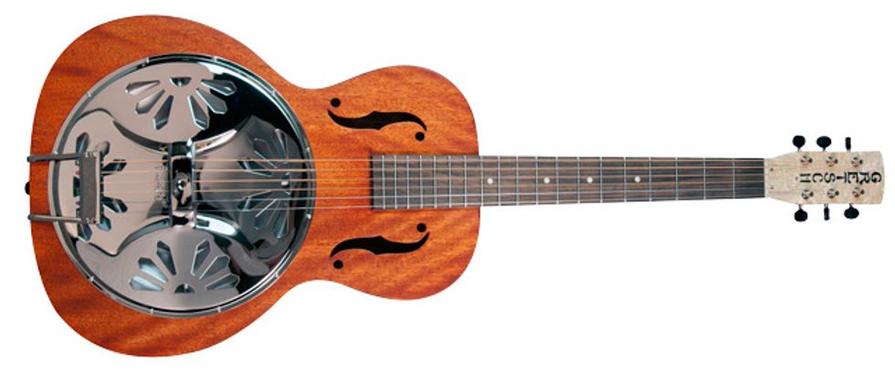 The Gretsch is feather-light and vintage styled from its aged pearloid headstock to the soft V-shape of the neck. The body, back, and sides, are built from laminated Mahogany and feature twin f-holes on the top, while the neck is mahogany with a rosewood fretboard. But the heart of the Gretsch is the resonator, which Gretsch has dubbed the Ampli-sonic and built from 99% pure aluminum that is hand spun in Eastern Europe. Black, open-gear Grover tuners are an attractive addition. And the only construction flaw I could detect was a spot of underspray around one of the f-holes.