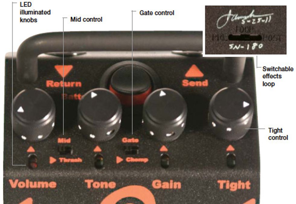 The TightMetal also features Amptweaker’s standard series effects loop, which can be set for either Pre or Post to position the TightMetal in the effects chain. Some really neat tones can be coaxed out of the pedal using this feature. You can place a compressor in the loop and set the loop to Pre to smooth things out even further. You can also use delays and reverbs with the loop set to Post to craft huge, spaced-out, post-rock soundscapes.