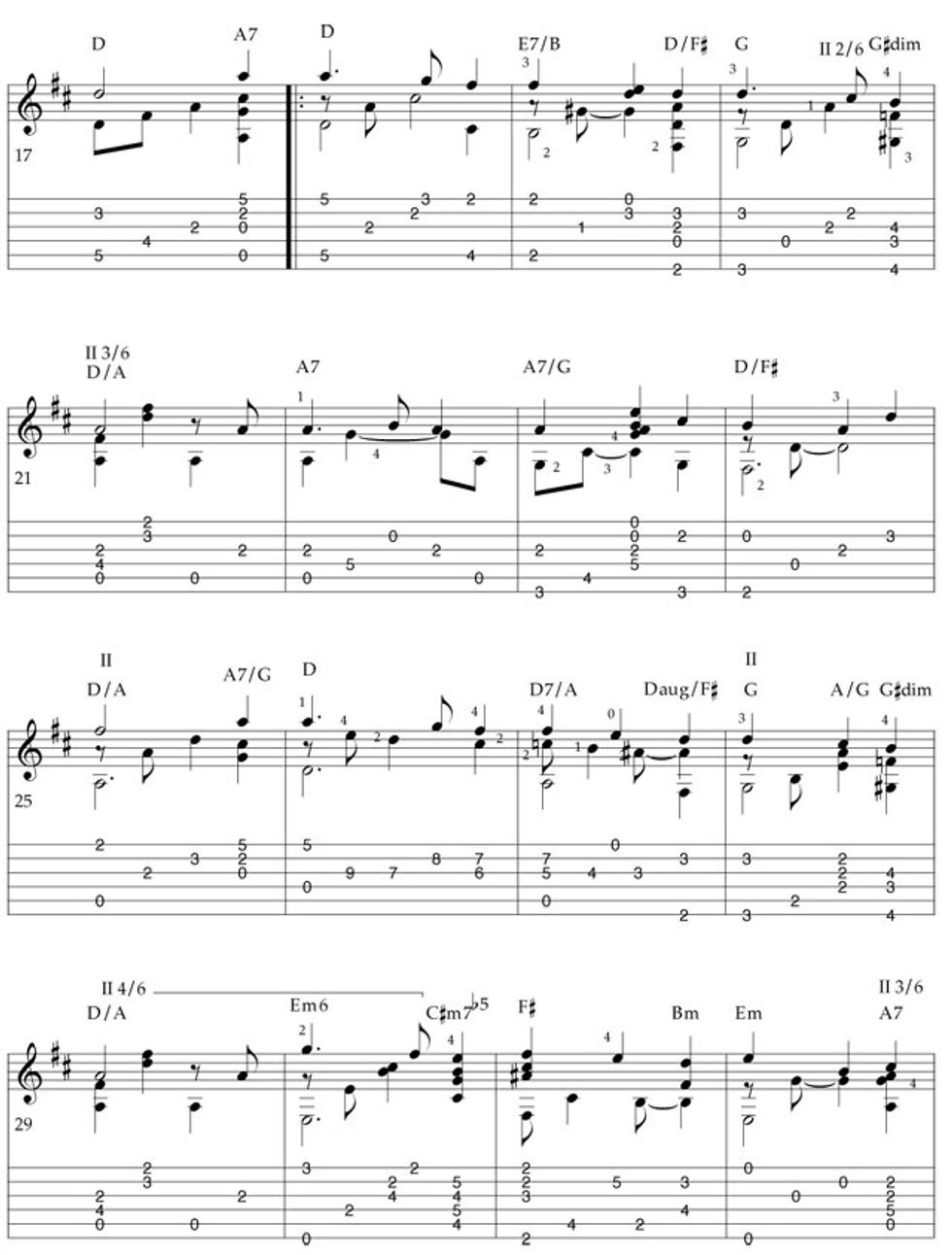 • Notice the vi–ii–V–I progression beginning on beat three of measure 31. The vi chord is often played in front of the ii chord.