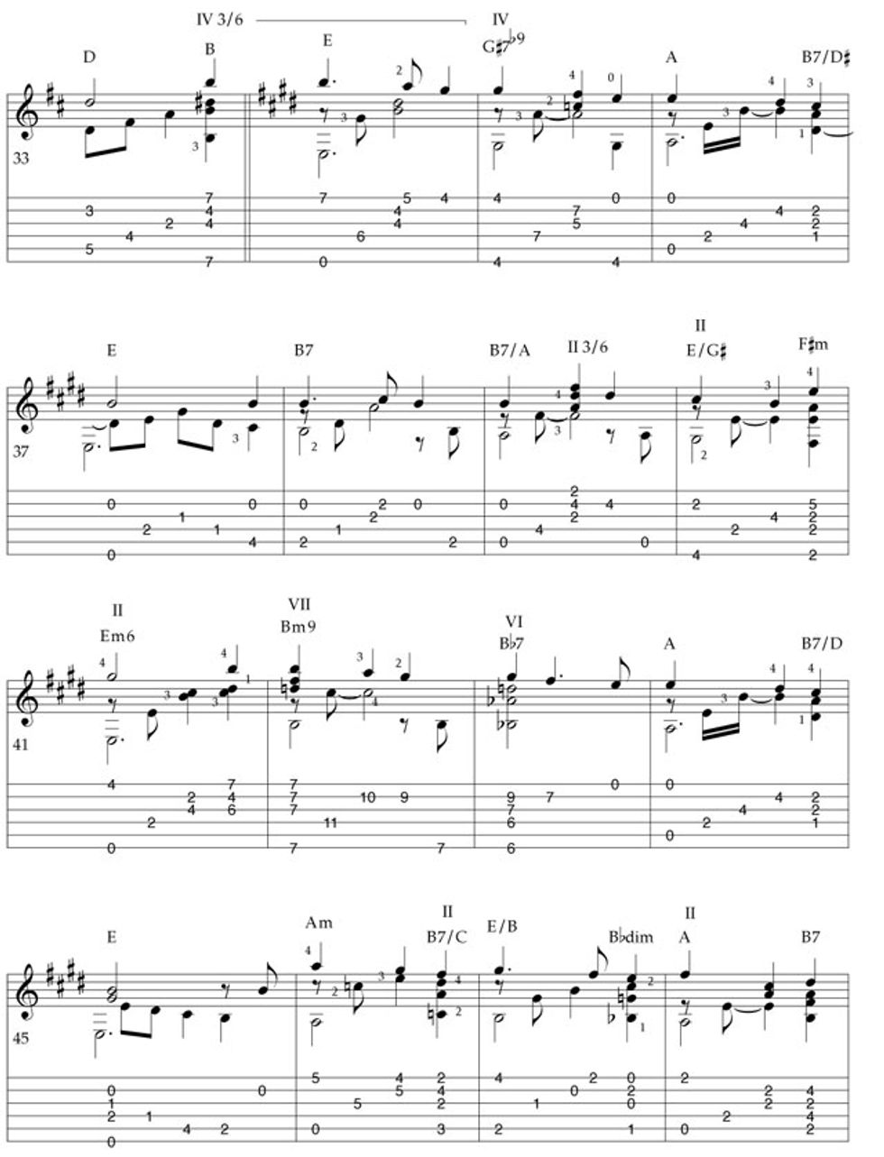 • The B chord on the third beat of measure 33 sets up the key change to E.