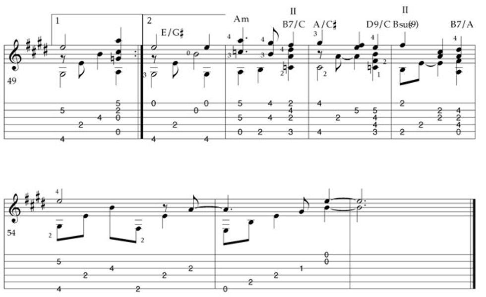 • Notice the C diminished on beat three of measure 46. This is like playing a B7 with a flat 9th in the bass. The root note (B) is not in the chord, but could be. This chord choice sets up a nice bass line leading into measures 47 and 48.
