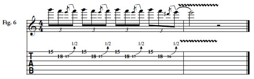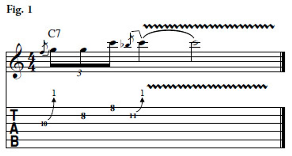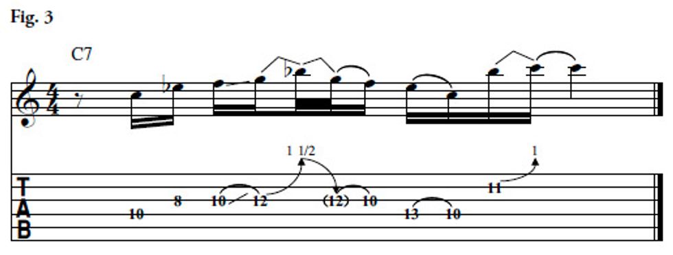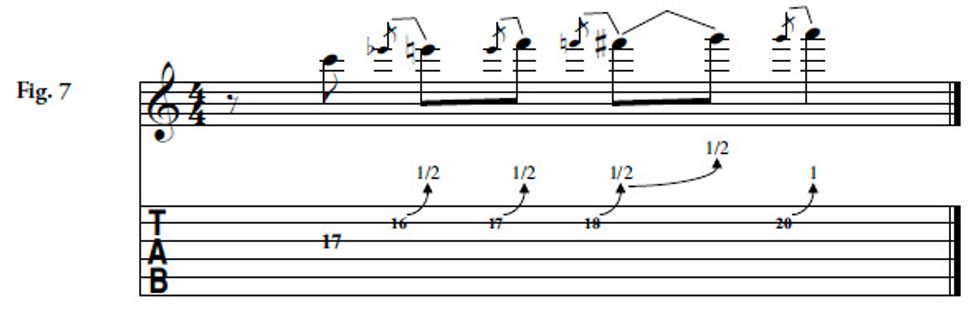 Fig. 6 is a slick little move that works great over C7 and contains a bend from the 3 to the 4 in a very Jeff Beck-like fashion. The last example, shown in Fig. 7, is a cool move that advances chromatically from the b3 up to the 5—all done with bends.