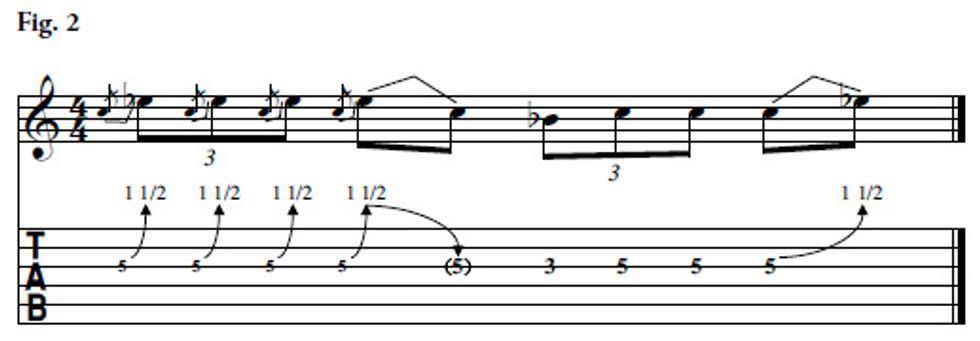 There are two minor-third intervals in the scale, C–Eb and G–Bb. The bend between the root and b3 as shown in Fig. 2 was a staple of Eric Clapton’s playing during the Cream era. This is often called an overbend, but really all we’re doing is bending within the scale. I’ve got to say I love this sound. Check out Clapton’s playing on Wheels of Fire for a great lesson on this particular bend. Actually check out everything he plays on that album!