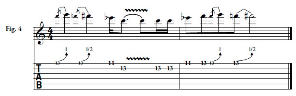 We move to the other minor-third interval in Fig. 3. This is a classic sound that I first picked up from listening to Jimi Hendrix. Now we have covered whole-step and minor-third bends, but let’s go deeper. In Fig. 4 we have a lick in the style of Albert King that will add a “blue” note, which will bring some half-step bends into the mix. Make sure to keep each bend in tune.