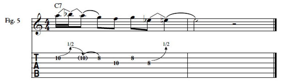 In my previous column [“The Composite Blues Scale,” June 2011], I discussed the composite blues scale, which is basically a scale derived from mixing both the major and minor blues scales. This adds some very cool notes that we can bend up to and out of. In Fig. 5, I take advantage of these half-steps by bending the 6 to the b7 and ending with a very cool bend from the b3 to the 3 of a C7 chord.