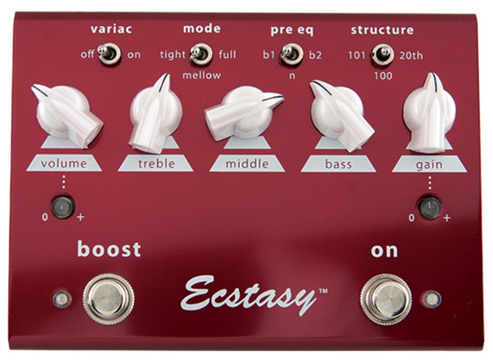 Both pedals share the same simple control layout. There are knobs for volume, gain, treble, mids, and bass, which handle the majority of tone-shaping tasks. Located directly above those are four switches that change the gain structure, response, and feel. The first of these is dubbed variac, which acts like an actual Variac transformer by lowering the pedal’s voltage, giving the tone more sag and pulling back the volume to more neighbor-friendly levels. Next to it is a mode switch that flips between lower (plexi) and higher (blues) gain modes on the Ecstasy Blue, and three different EQ curve and gain presets on the Ecstasy Red.