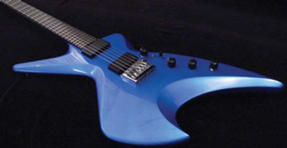 LEFT: This small jumbo Ergo Noir has a floating jazz-style pickguard. RIGHT: Fox’s blue Stag Leap electric features a radically shaped, deeply carved swamp ash body with a flamed hard-rock maple neck.