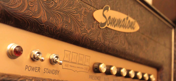 ![]() The front panel of Sommatone’s new Vibe-45 head, which features a badass tooled-leather covering and plexi-Marshall style interface. Photo by Chris Kies |