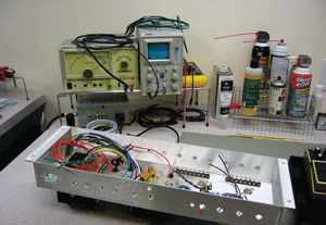 ![]() Somma’s ultra-clean workbench is outfitted with the requisite Lodestar audio generator, a Tenma oscilloscope, and a boatload of spray bottles. Photo by Michael Ross |