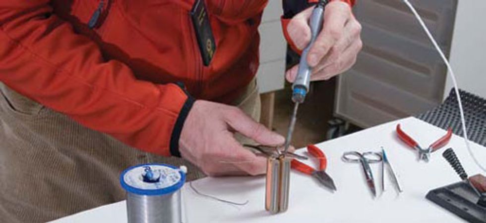 When assembling pickups, Teuffel first inserts the alnico magnets in a magnetic vice.