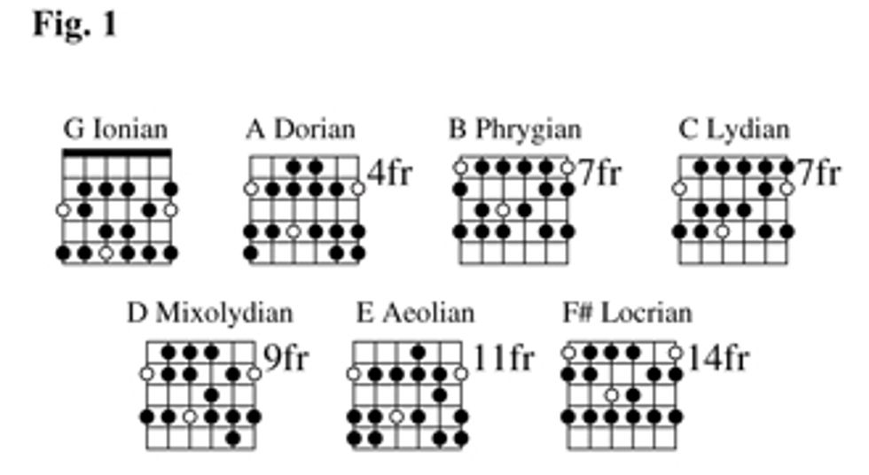 This means we will need three different Mixolydian scales to cover our blues progression. Most of us learn a set of seven different modal fingerings, one for each note of the major scale: Ionian, Dorian, Phrygian, Lydian, Mixolydian, Aeolian, and Locrian. Don’t worry If you haven’t done this yet, you’re about to learn three of them now. If you take a close look at most modal fingerings you’ll find that there are really only five different fingerings since the Ionian and Locrian fingerings are the same fingerings but just start on different fingers. You’ll also notice that Phrygian and Lydian are typically the same pattern as well, again just starting on different fingers. In Fig. 1 you can see how all the modes in the key of G major lay on the fretboard.