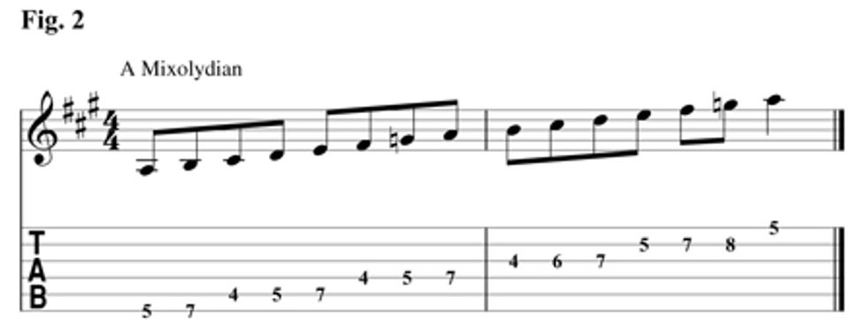 The I chord is easy, since A is the 5th scale degree of D major and that means we will use the A Mixolydian fingering shown in Fig. 2 over the I chord. This is the same fingering as the D Mixolydian scale in the first example, just moved down to the fifth fret.