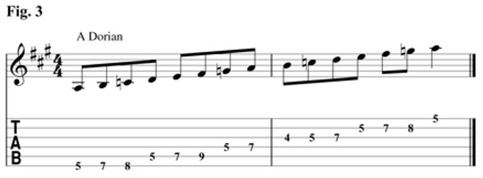 The next chord, D7 is the V chord of G major, and since A is the 2nd scale degree in the key of G, we’ll play the A Dorian fingering in Fig. 3 for the IV chord.