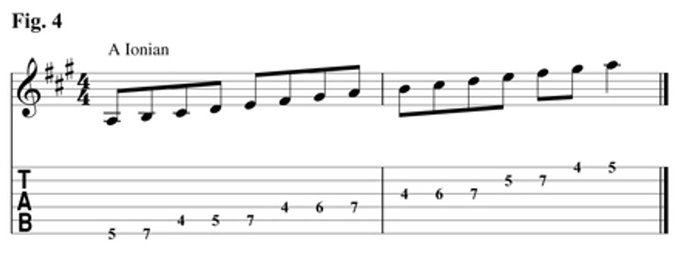 E7 is the V chord of A major, so we’ll play the A Ionian fingering illustrated in Fig. 4.