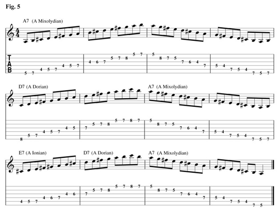 The exercise in Fig. 5 is a great way to get acquainted with any new chord progression using your modes as a tool to play in any one position. We want to play each scale pattern in time through the progression and change the scale when the chords change. This should be practiced slowly at first and then gradually sped up as your level of comfort increases. Download example 5 audio...