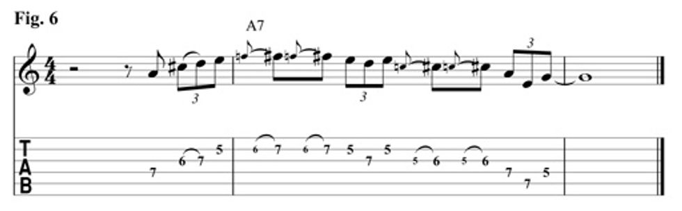 Fig. 6 is an A Mixolydian lick over an A7 chord. This licks emphasizes the 6th scale degree in the second measure then resolves to the b7th (G) of the A7th chord. Download example 6 audio...